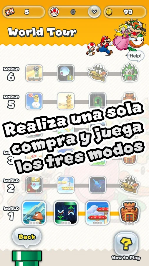 Completa los 24 niveles de los mundos para lograr llegar al castillo de Bowser. En tu paso por los niveles, intenta recoger los tres tipos de monedas de colores y competir para superar los récords de tus amigos. Puedes jugar los niveles del 1-1 al 1-4 de manera gratuita.