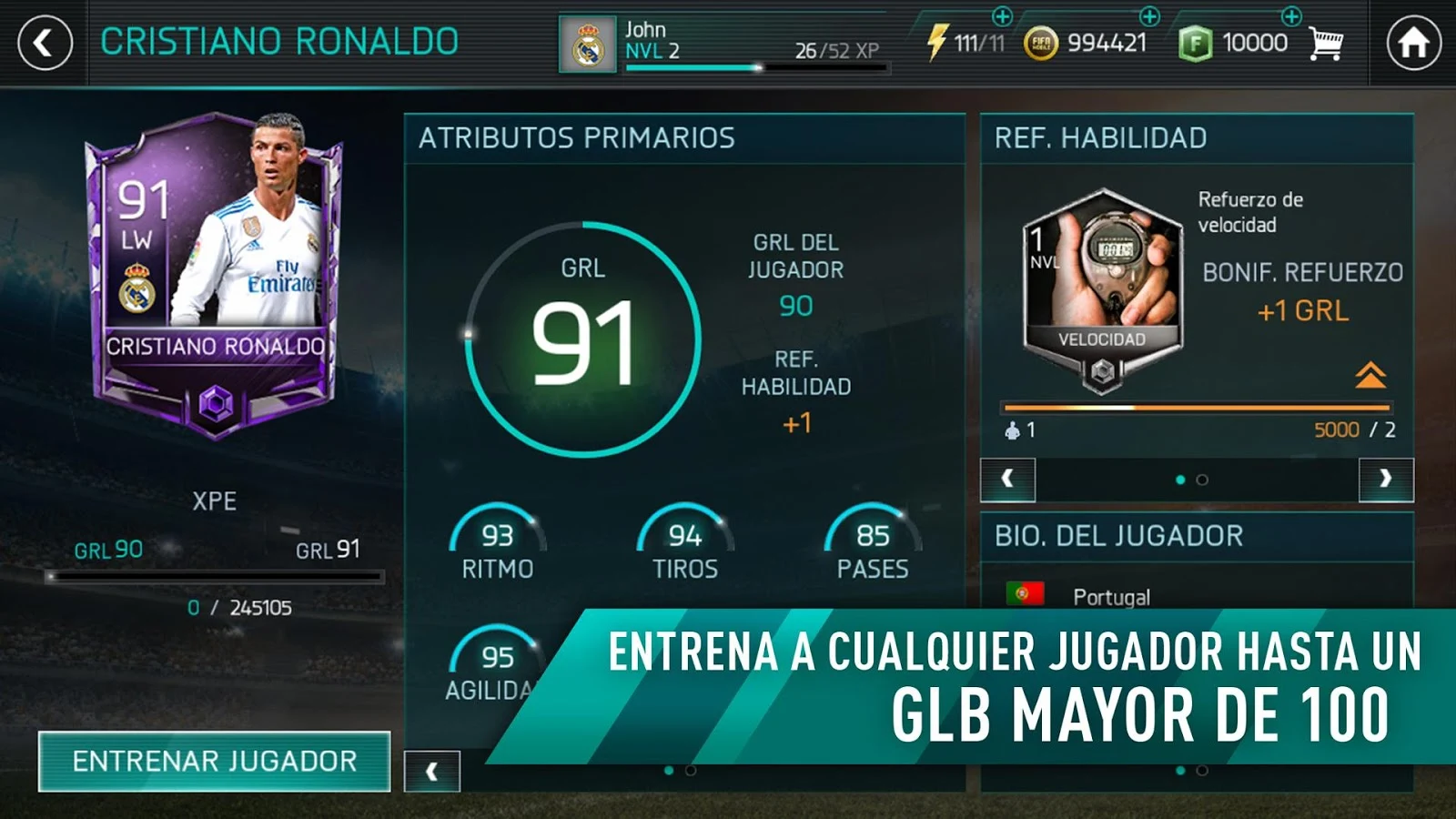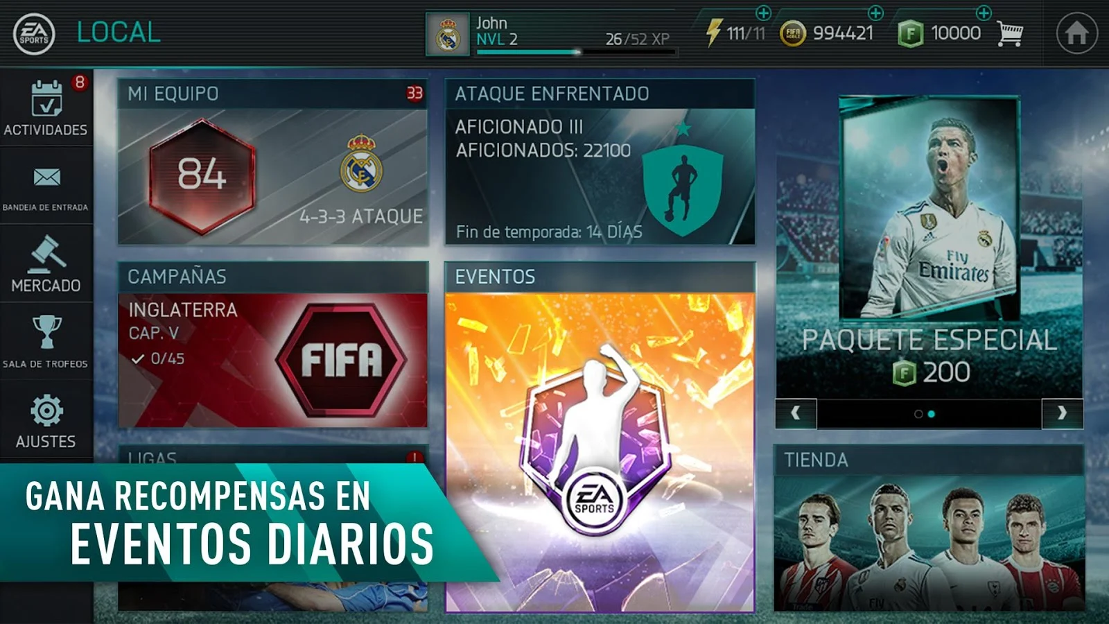 FIFA Mobile se redefinió para traerte el juego de futbol para celulares más auténtico y emocionante en la historia. Obtén un artículo de Cristiano Ronaldo gratis para comenzar a crear y gestionar tu equipo. Entrena a cualquier jugador para convertirlo en una superestrella, ataca a tus rivales y regresa para descubrir contenido diario durante toda la temporada. Además, ingresa al juego cuando quieras con un tamaño de descarga inferior a los 100 MB. Ya seas un habilidoso veterano o recién comiences en la cancha de futbol, FIFA Mobile es la mejor forma de jugarlo.